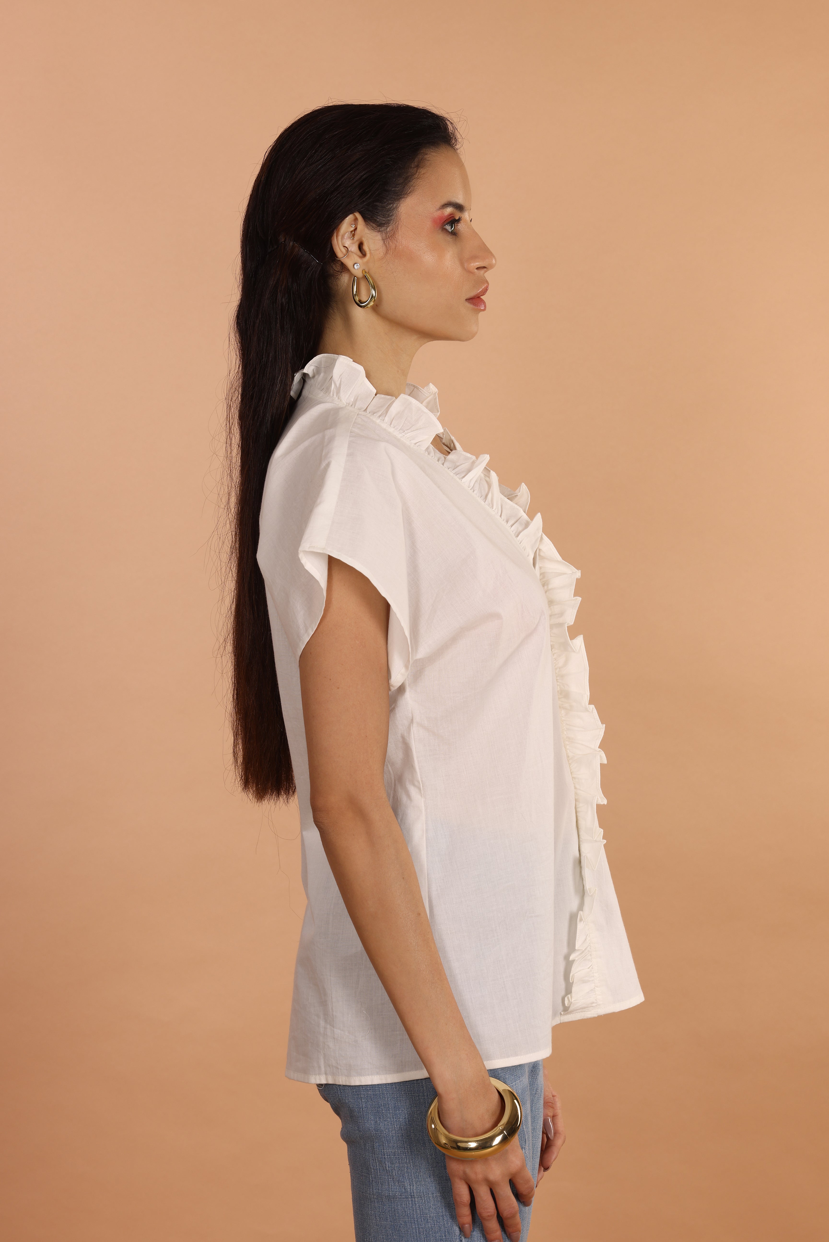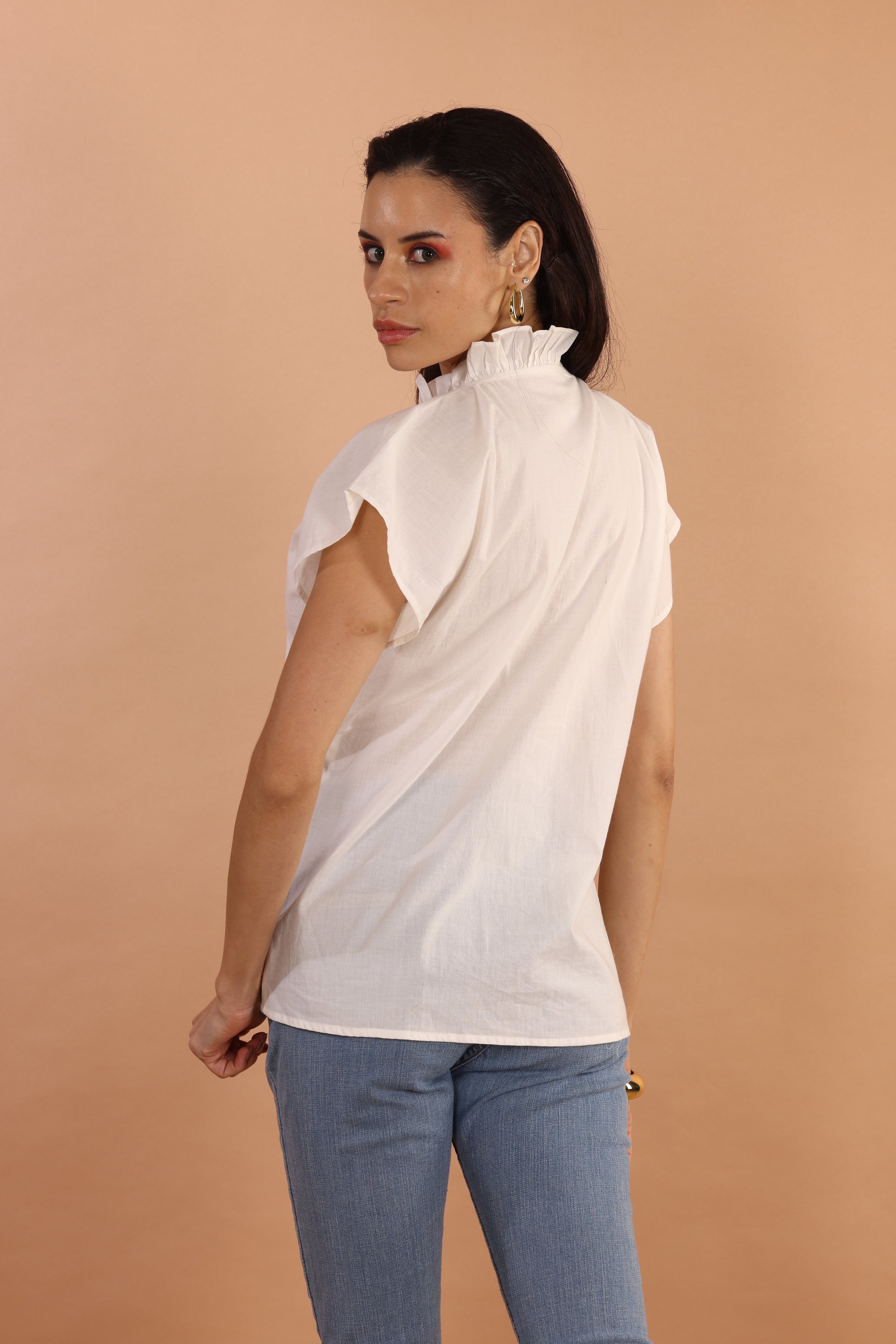 Elevate your wardrobe with this timeless white top, featuring delicate ruffle detailing along the V-neckline and placket for a soft, romantic touch. The wide flutter sleeves add a graceful flair, while the crisp cotton fabric ensures all-day comfort. Perfect for workdays or weekend brunches, this versatile piece brings understated elegance to every look.